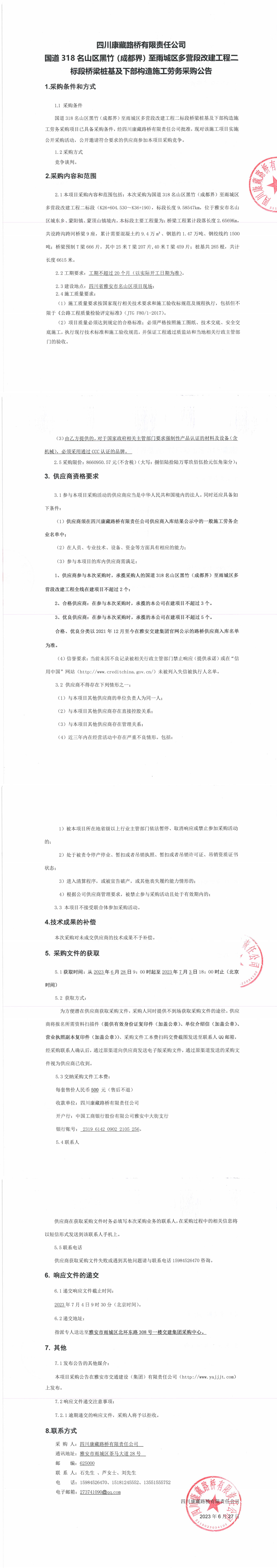 四川康藏路橋有限責(zé)任公司國(guó)道318名山區(qū)黑竹(成都界)至雨城區(qū)多營(yíng)段改建工程二標(biāo)段橋梁樁基及下部構(gòu)造施工勞務(wù)采購(gòu)公告