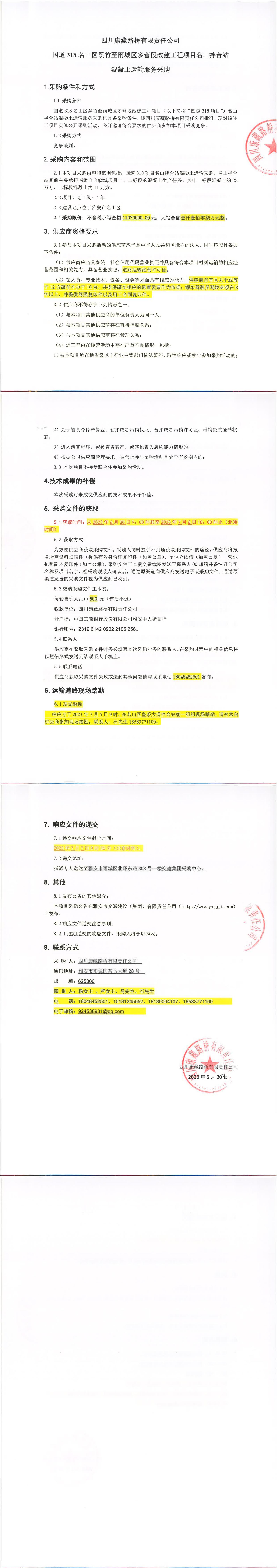 四川康藏路橋有限責(zé)任公司國道318名山區(qū)黑竹至雨城區(qū)多營段改建工程項目名山拌合站混凝土運輸服務(wù)采購