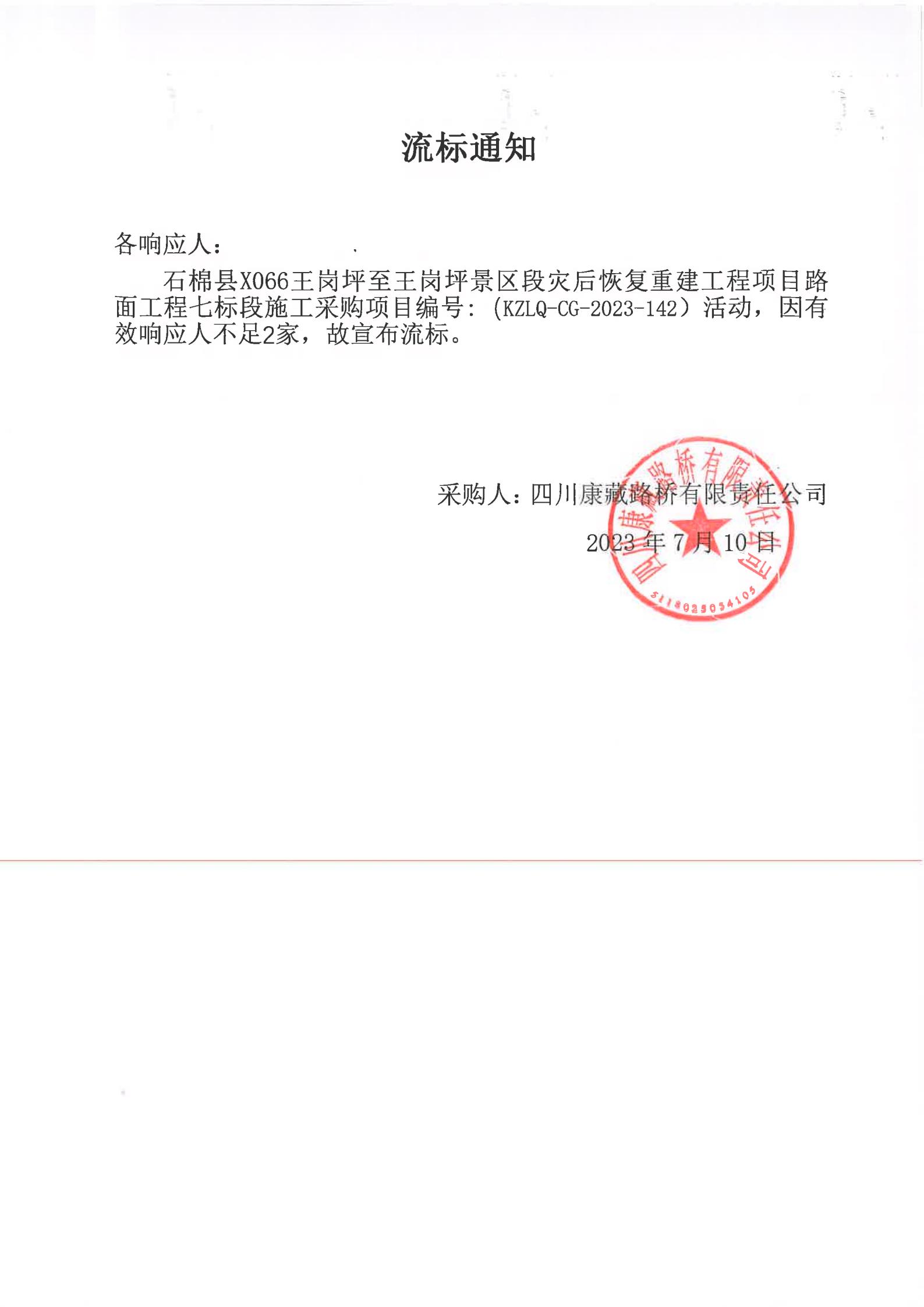 四川康藏路橋有限責(zé)任公司石棉縣X066王崗坪至王崗坪景區(qū)段災(zāi)后恢復(fù)重建工程項(xiàng)目路面工程七標(biāo)段施工采購(gòu)流標(biāo)通知