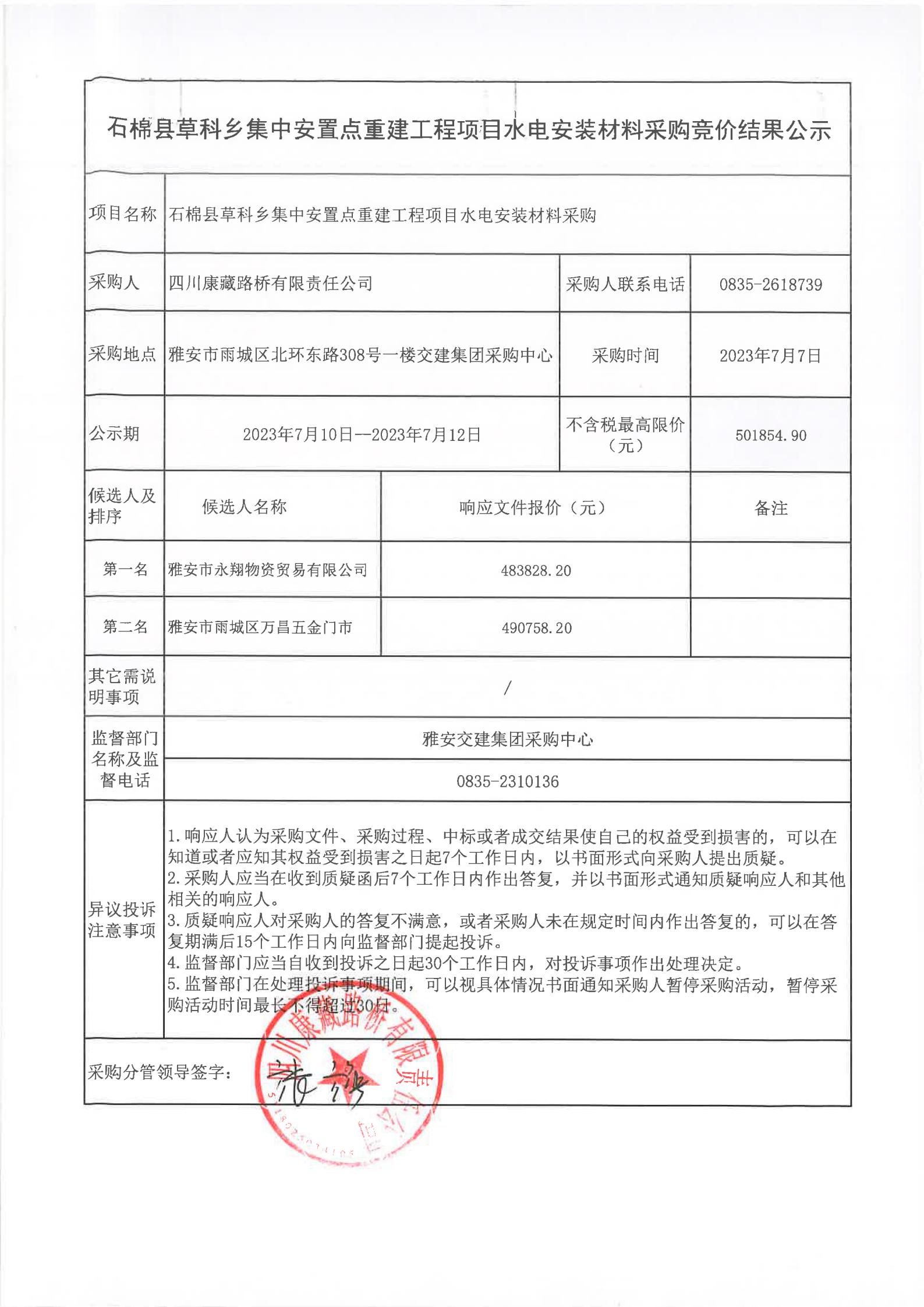 四川康藏路橋有限責任公司石棉草科鄉(xiāng)集中安置點重建工程項目水電安裝材料采購競價結果公示