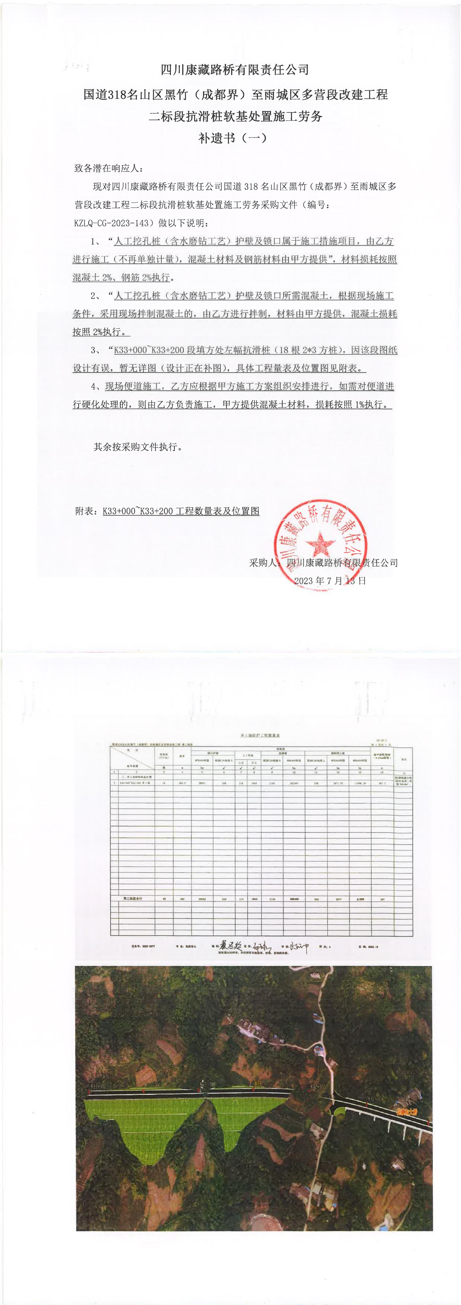 四川康藏路橋有限責(zé)任公司國道318名山區(qū)黑竹(成都界)至雨城區(qū)多營段改建工程二標(biāo)段抗滑樁軟基處置施工勞務(wù)補(bǔ)遺書(一))