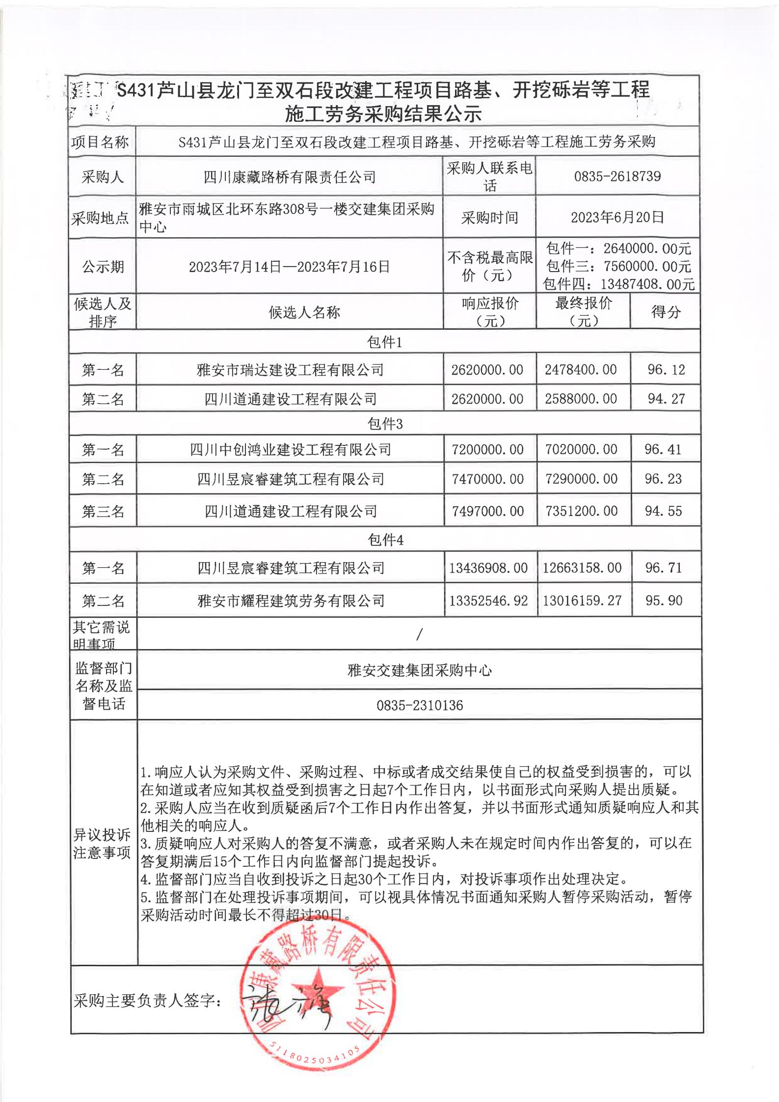 四川康藏路橋有限責(zé)任公司S431蘆山縣龍門(mén)至雙石段改建工程項(xiàng)目路基、開(kāi)挖礫巖等工程施工勞務(wù)采購(gòu)結(jié)果公示