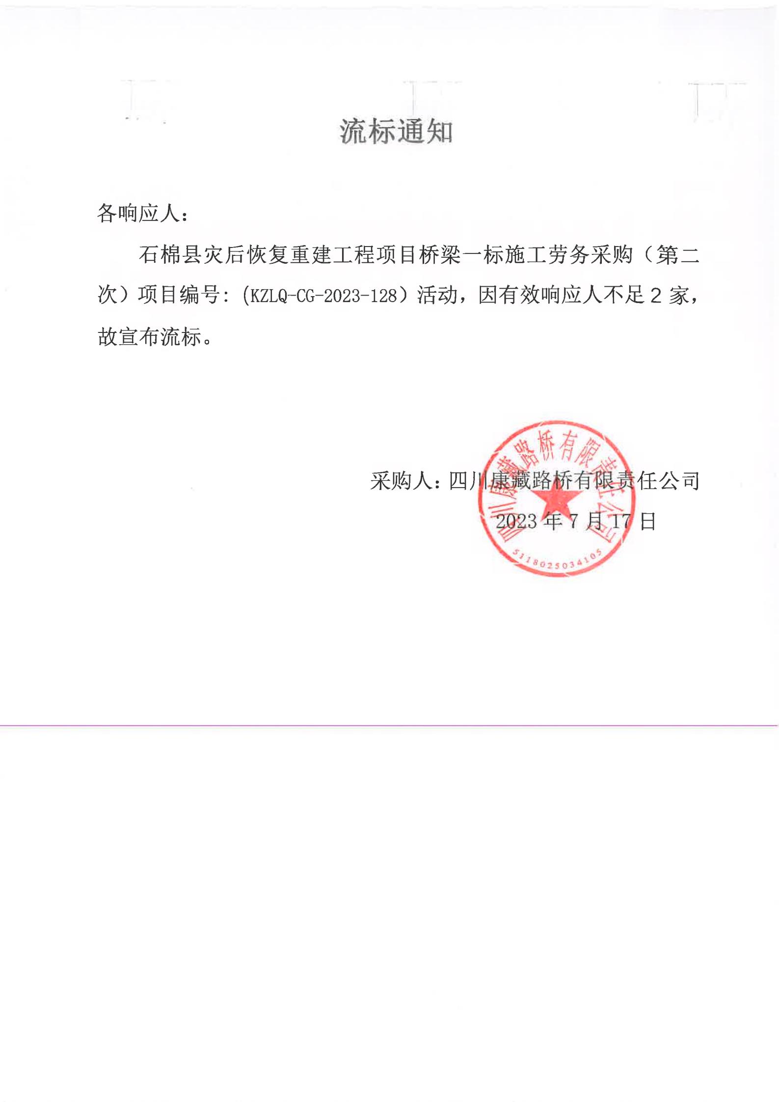 四川康藏路橋有限責任公司石棉縣災后恢復重建工程項目橋梁一標段施工勞務采購(第二次)流標通知