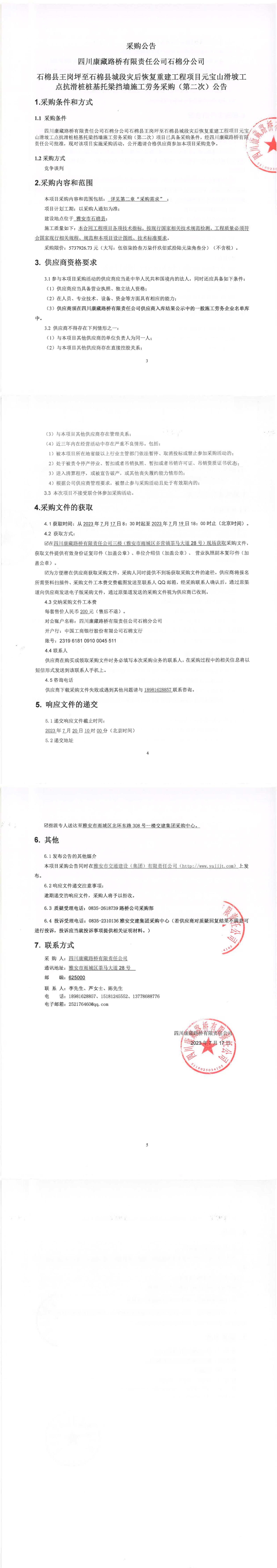 四川康藏路橋有限責(zé)任公司石棉分公司石棉縣王崗坪至石棉縣城段災(zāi)后恢復(fù)重建工程項(xiàng)目元寶山滑坡工點(diǎn)抗滑樁樁基托梁擋墻施工勞務(wù)采購(第二次)公告