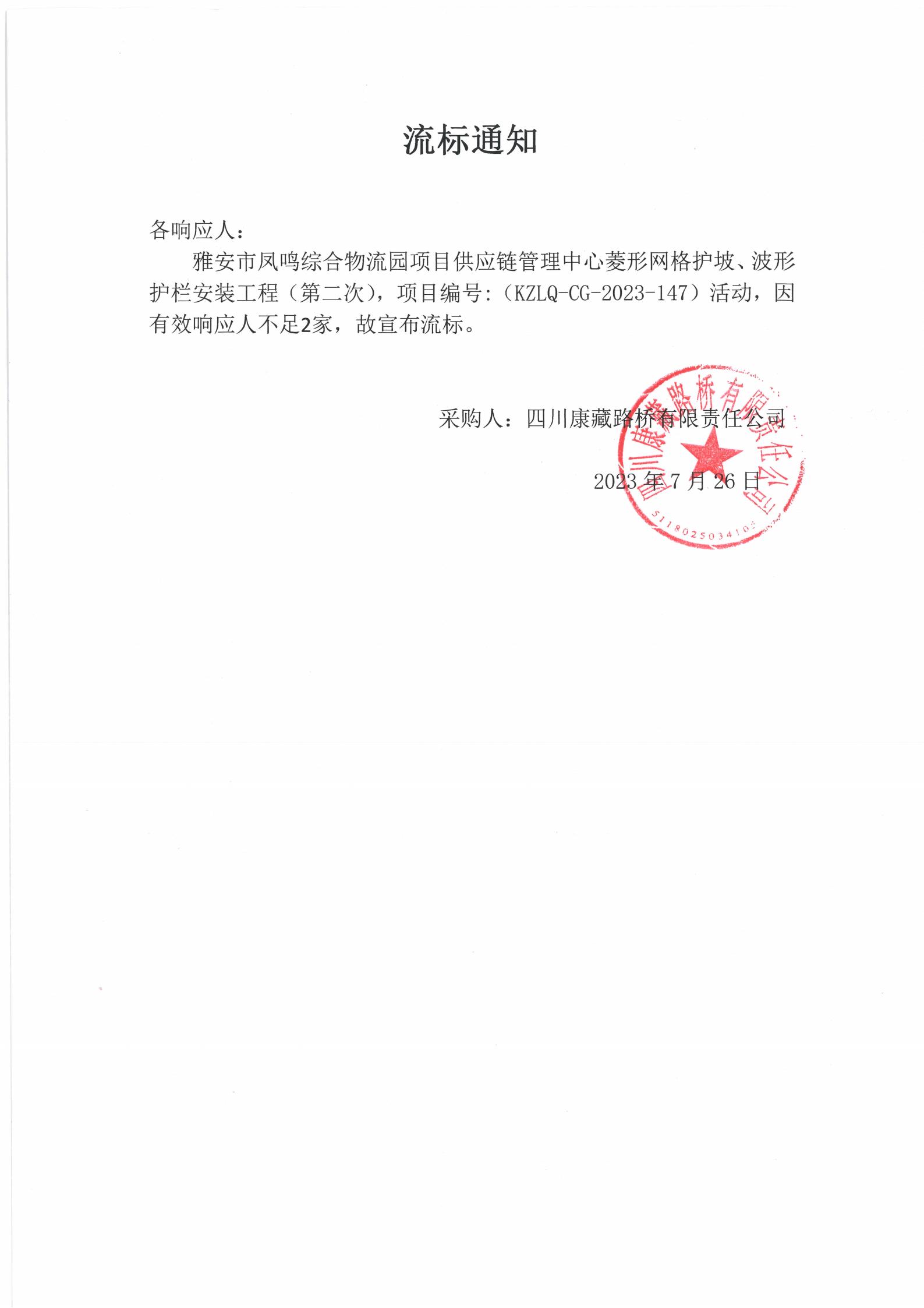 四川康藏路橋有限責任公司雅安市鳳鳴綜合物流園項目供應鏈管理中心菱形網格護坡、波形護欄安裝工程(第二次)流標通知