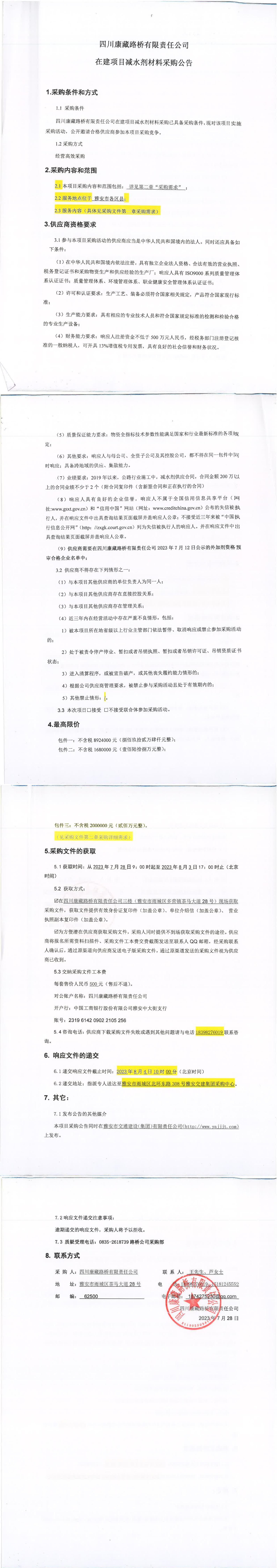 四川康藏路橋有限責(zé)任公司在建項目減水劑材料采購公告