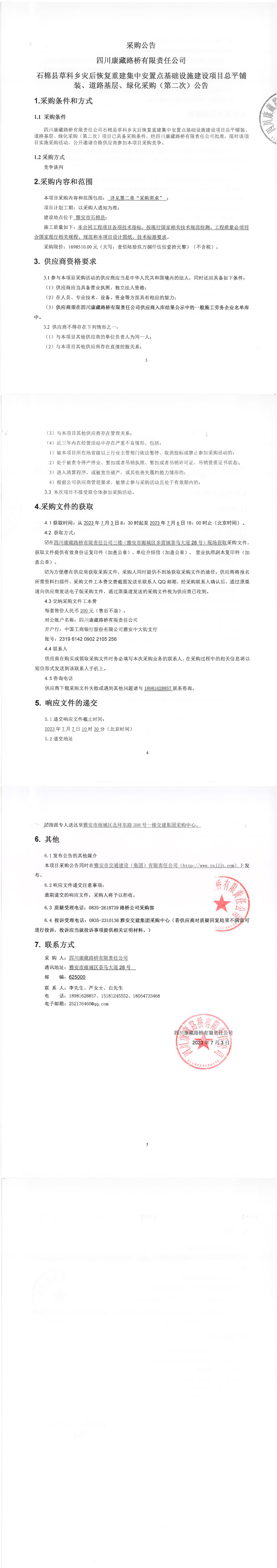 四川康藏路橋有限責(zé)任公司石棉縣草科鄉(xiāng)災(zāi)后恢復(fù)重建集中安置點基礎(chǔ)設(shè)施建設(shè)項目總平鋪裝、道路基層、綠化采購(第二次)公告