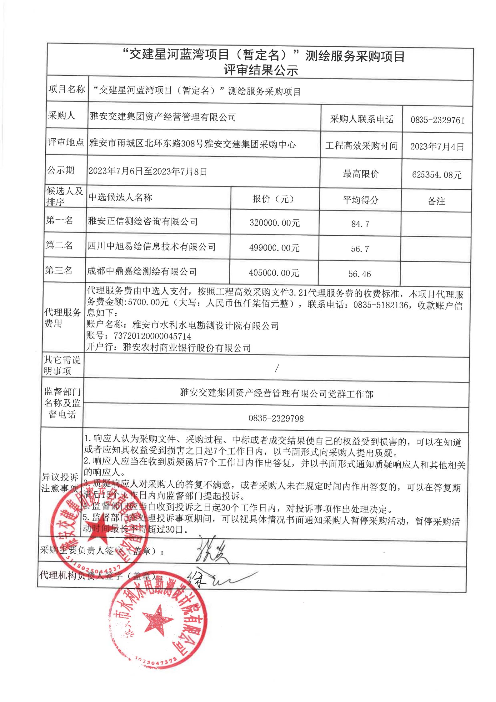 雅安交建集團資產(chǎn)經(jīng)營管理有限公司“交建星河藍(lán)灣項目(暫定名)”測繪服務(wù)采購項目評審結(jié)果公示