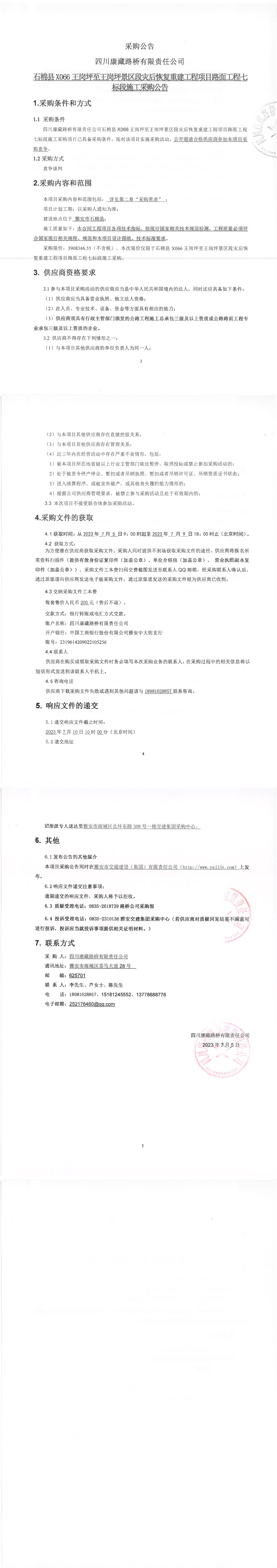 四川康藏路橋有限責(zé)任公司石棉縣X66X王崗坪景區(qū)段災(zāi)后恢復(fù)重建工程項(xiàng)目路面工程七標(biāo)段施工采購公告