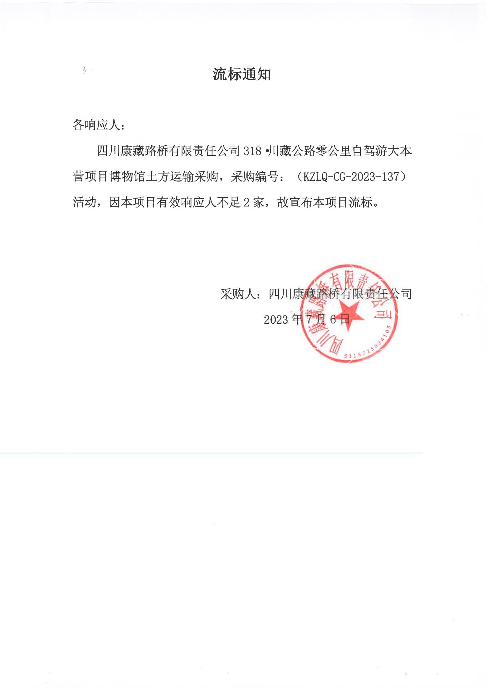 四川康藏路橋有限責(zé)任公司318·川藏公路零公里自駕游大本營項目博物館土方運輸采購流標(biāo)通知