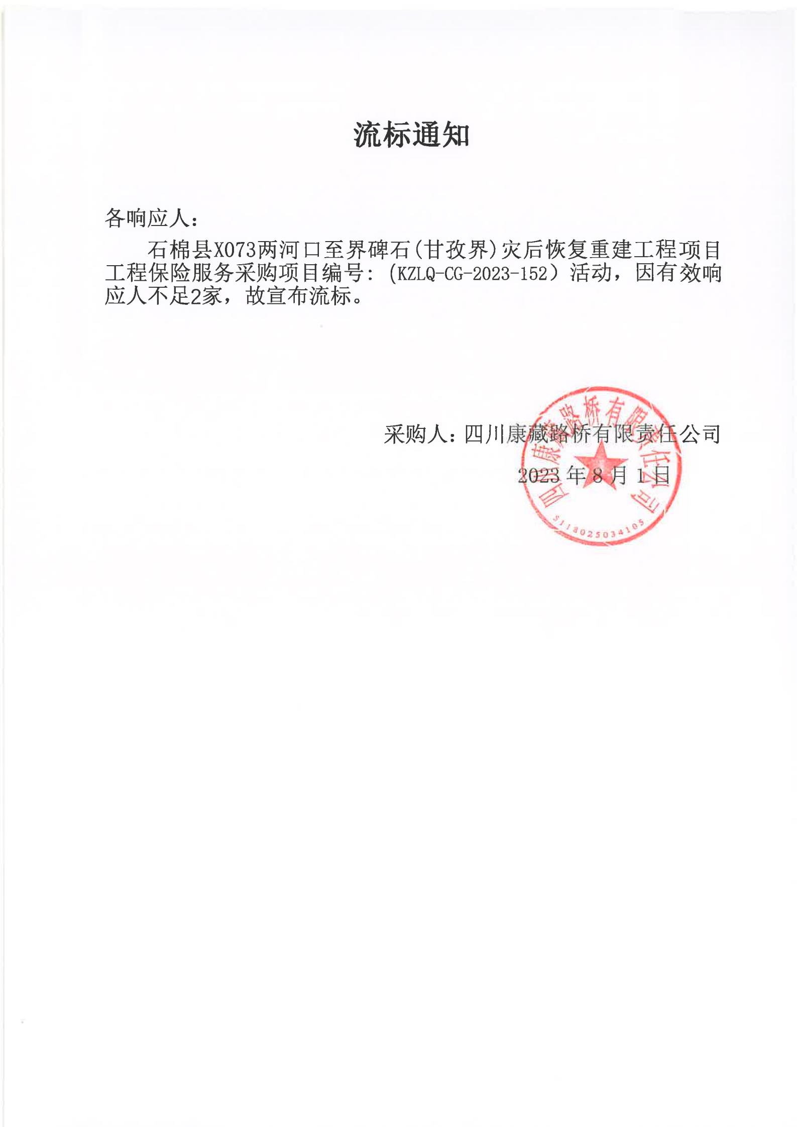 四川康藏路橋有限責(zé)任公司石棉分公司石棉縣X073兩河口至界碑石(甘孜界)災(zāi)后恢復(fù)重建工程項(xiàng)目工程保險(xiǎn)服務(wù)采購(gòu)項(xiàng)目流標(biāo)通知