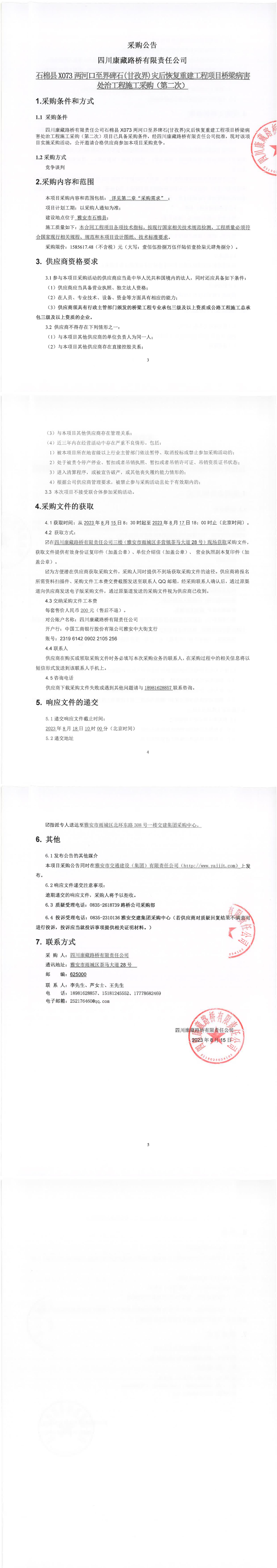 四川康藏路橋有限責(zé)任公司石棉縣X703兩河口至界碑石(甘孜界)災(zāi)后恢復(fù)重建工程項(xiàng)目橋梁病害處治工程施工采購(第二次)