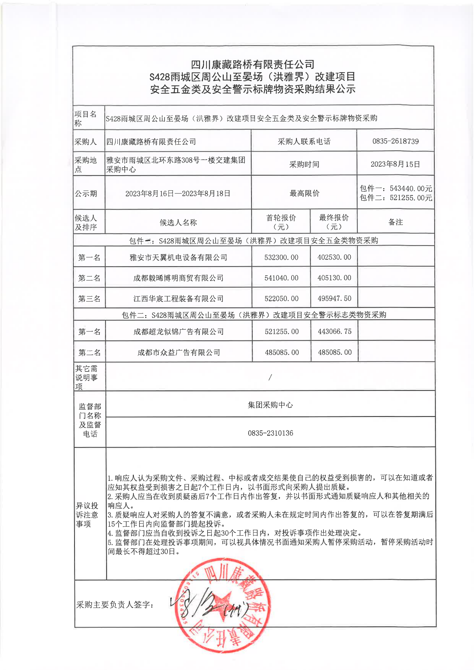 四川康藏路橋有限責任公司S428雨城區(qū)周公山至晏場(洪雅界)改建項目安全五金類及安全警示標牌物資采購結果公示