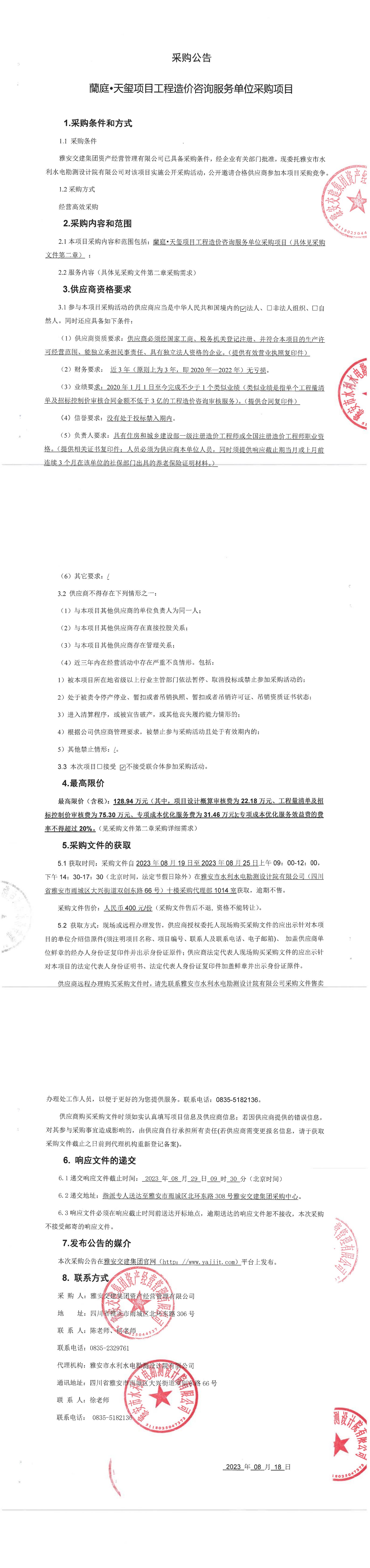 雅安交建集團(tuán)資產(chǎn)經(jīng)營管理有限公司蘭庭·天璽項目工程造價咨詢服務(wù)單位采購項目采購公告