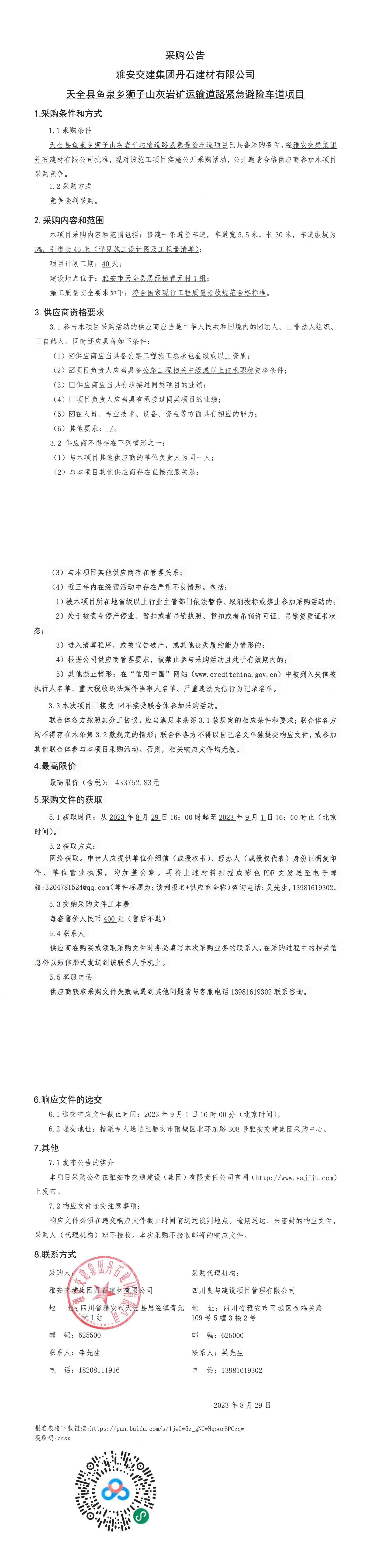 雅安交建集團(tuán)丹石建材有限公司天全縣魚泉鄉(xiāng)獅子山灰?guī)r礦運(yùn)輸?shù)缆肪o急避險(xiǎn)車道項(xiàng)目采購(gòu)公告