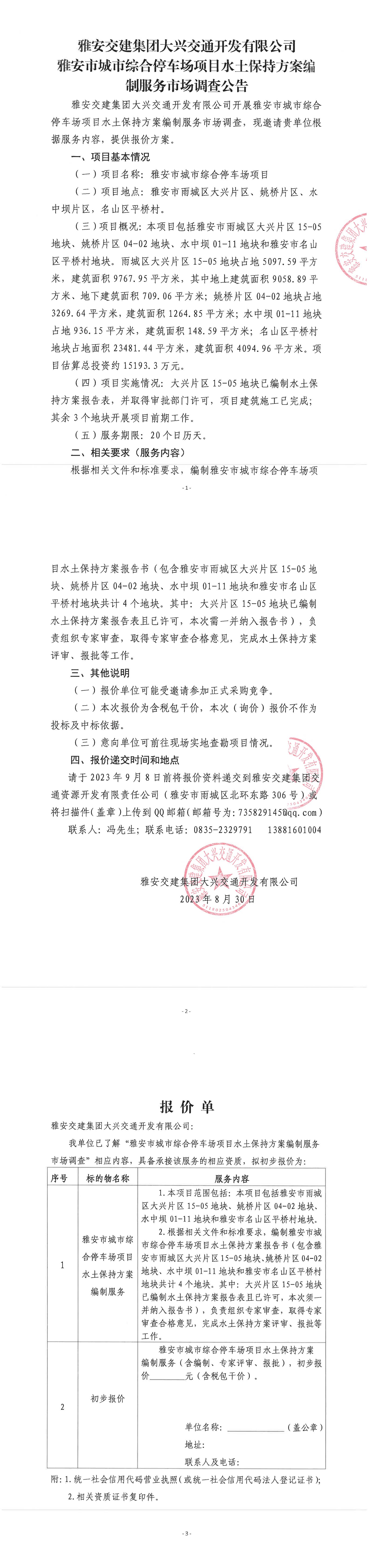 雅安交建集團(tuán)大興交通開發(fā)有限公司雅安市城市綜合停車場項目水土保持方案編制服務(wù)市場調(diào)查公告