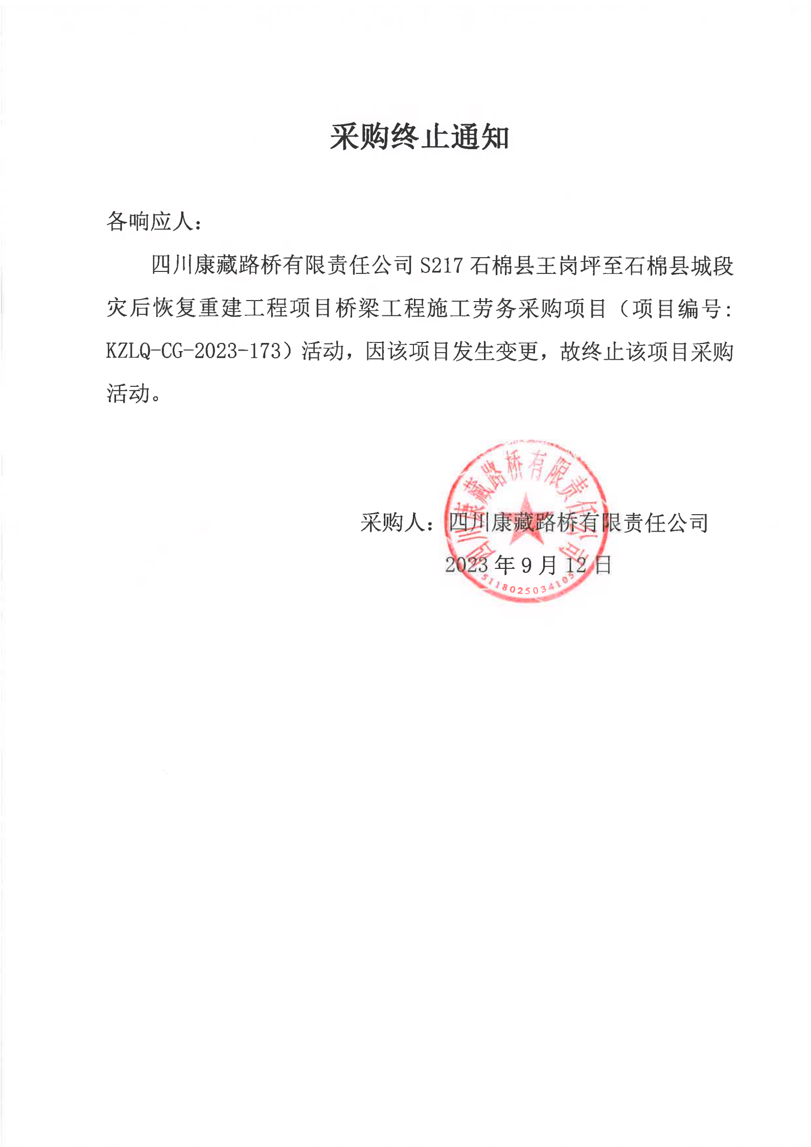 四川康藏路橋有限責(zé)任公司S217石棉縣王崗坪至石棉縣城段災(zāi)后恢復(fù)重建工程項目橋梁工程施工勞務(wù)項目采購終止通知