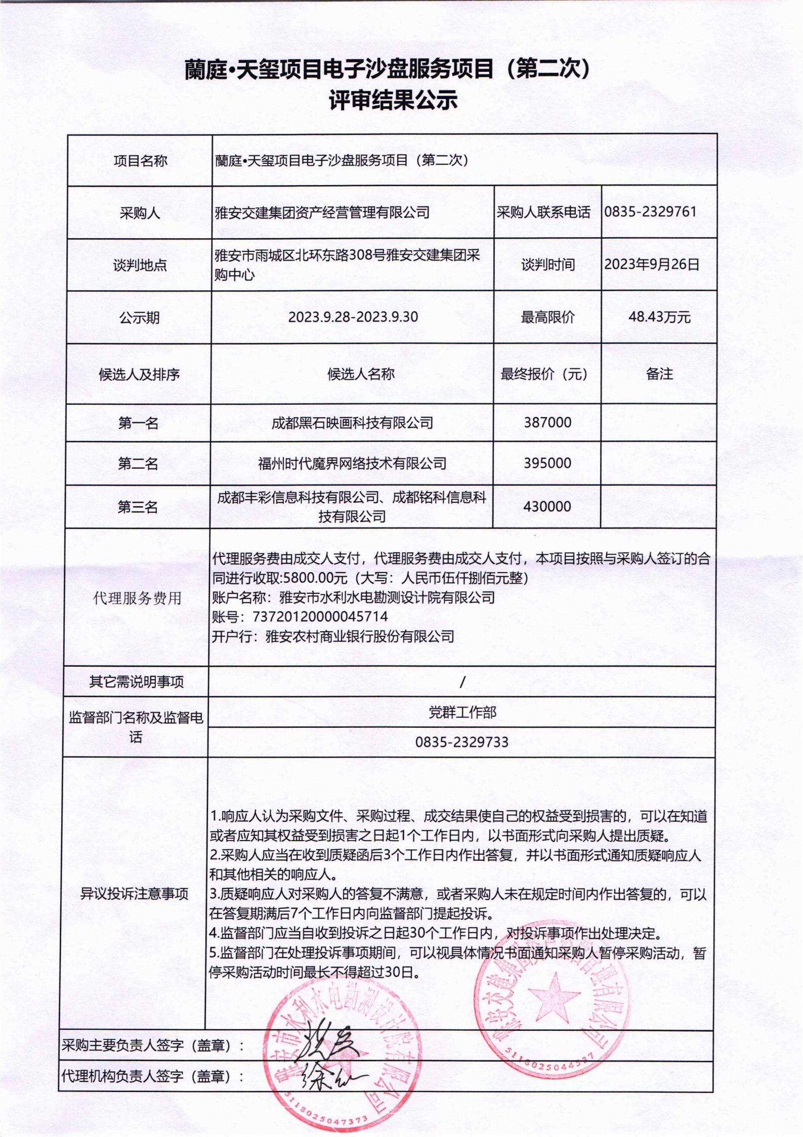 雅安交建集團資產(chǎn)經(jīng)營管理有限公司蘭庭•天璽項目電子沙盤服務項目(第二次)評審結果公示