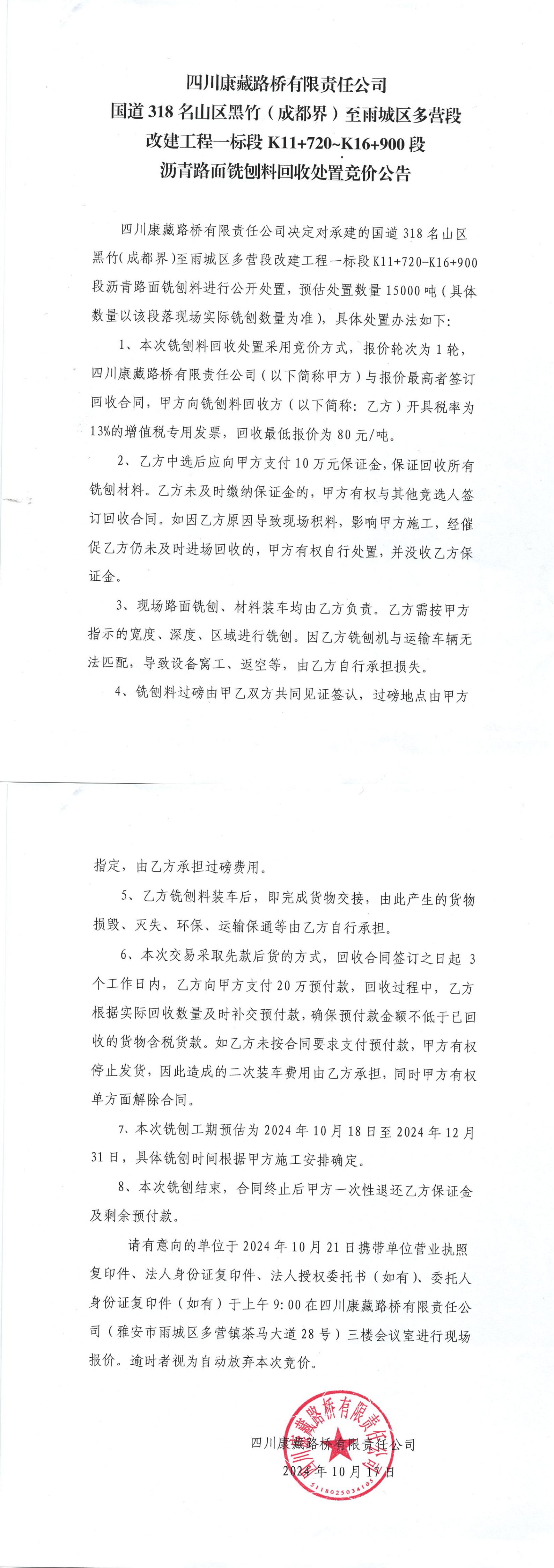 四川康藏路橋有限責任公司國道318名山區(qū)黑竹(成都界)至雨城區(qū)多營段改建工程一標段K11+720—K16+900段瀝青路面銑刨料回收處置競價公告