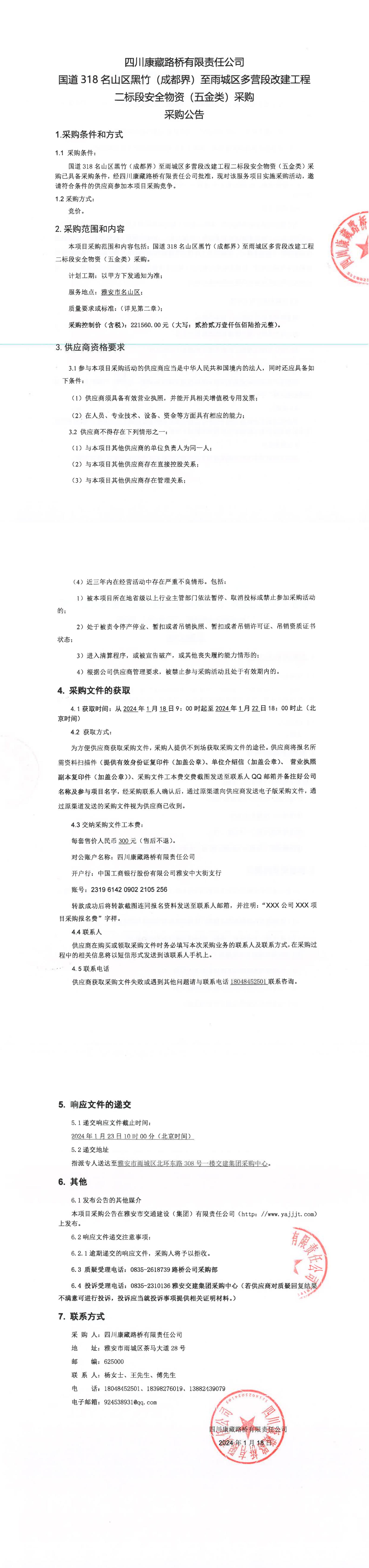 四川康藏路橋有限責(zé)任公司國道318名山區(qū)黑竹(成都界)至名山區(qū)多營段改建工程二標(biāo)段安全物資(五金類)采購公告