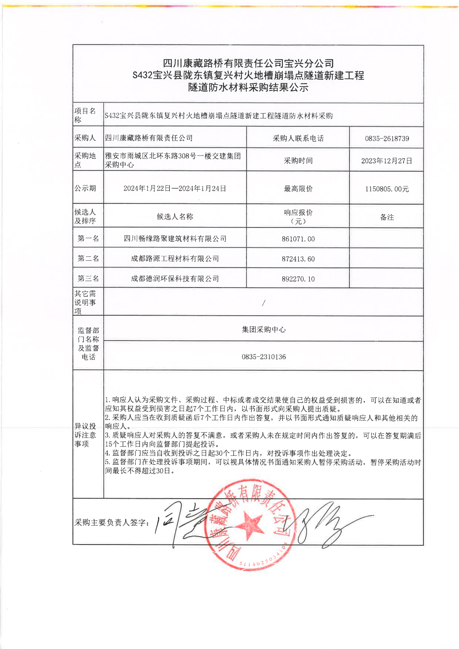 四川康藏路橋有限責(zé)任公司寶興分公司S432寶興縣隴東鎮(zhèn)復(fù)興村火地槽崩塌點(diǎn)隧道新建工程隧道防水材料采購(gòu)結(jié)果公示