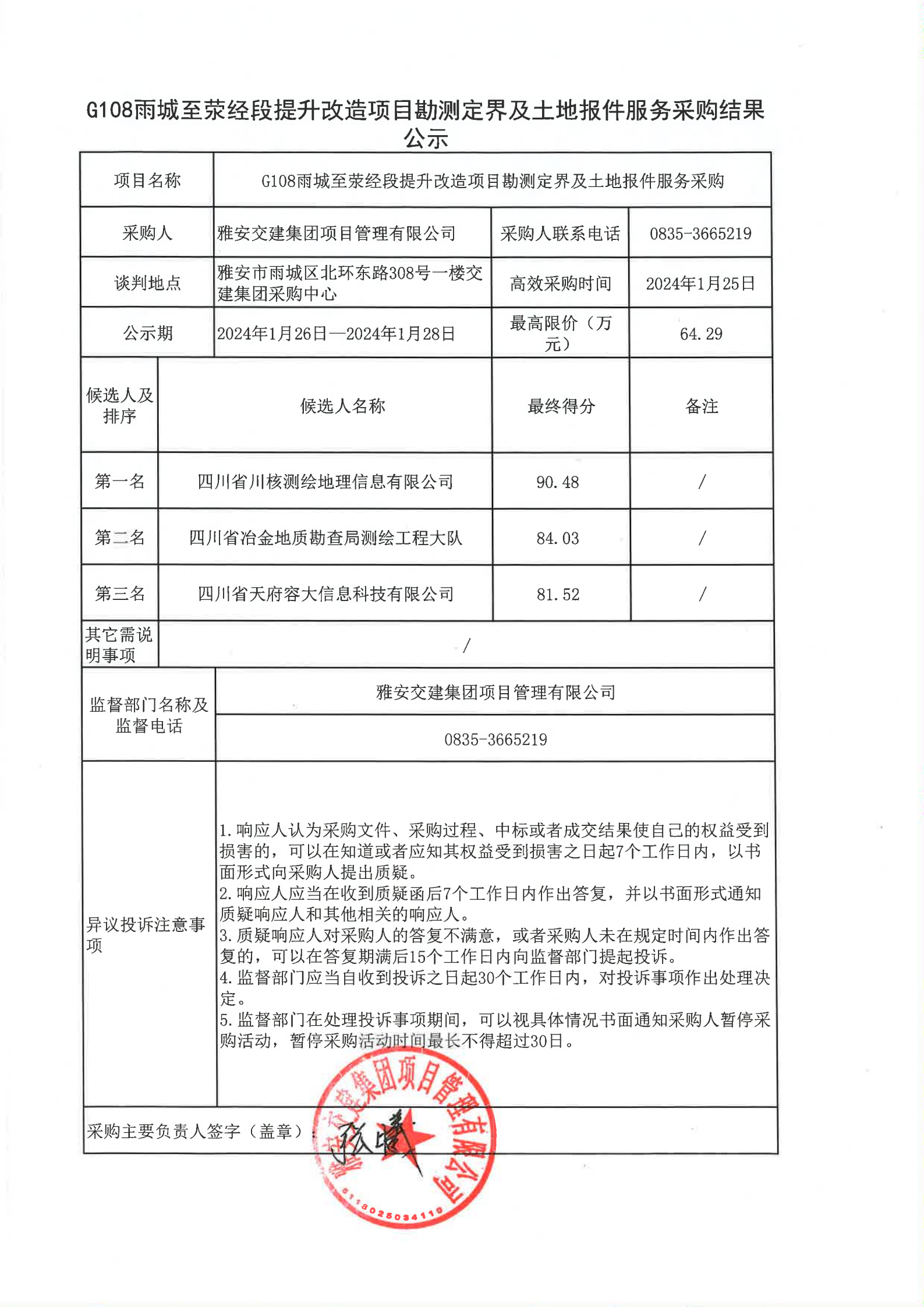 四川康藏路橋有限責任公司G108雨城至滎經(jīng)段提升改造項目勘測定界及土地報件服務采購結果公示