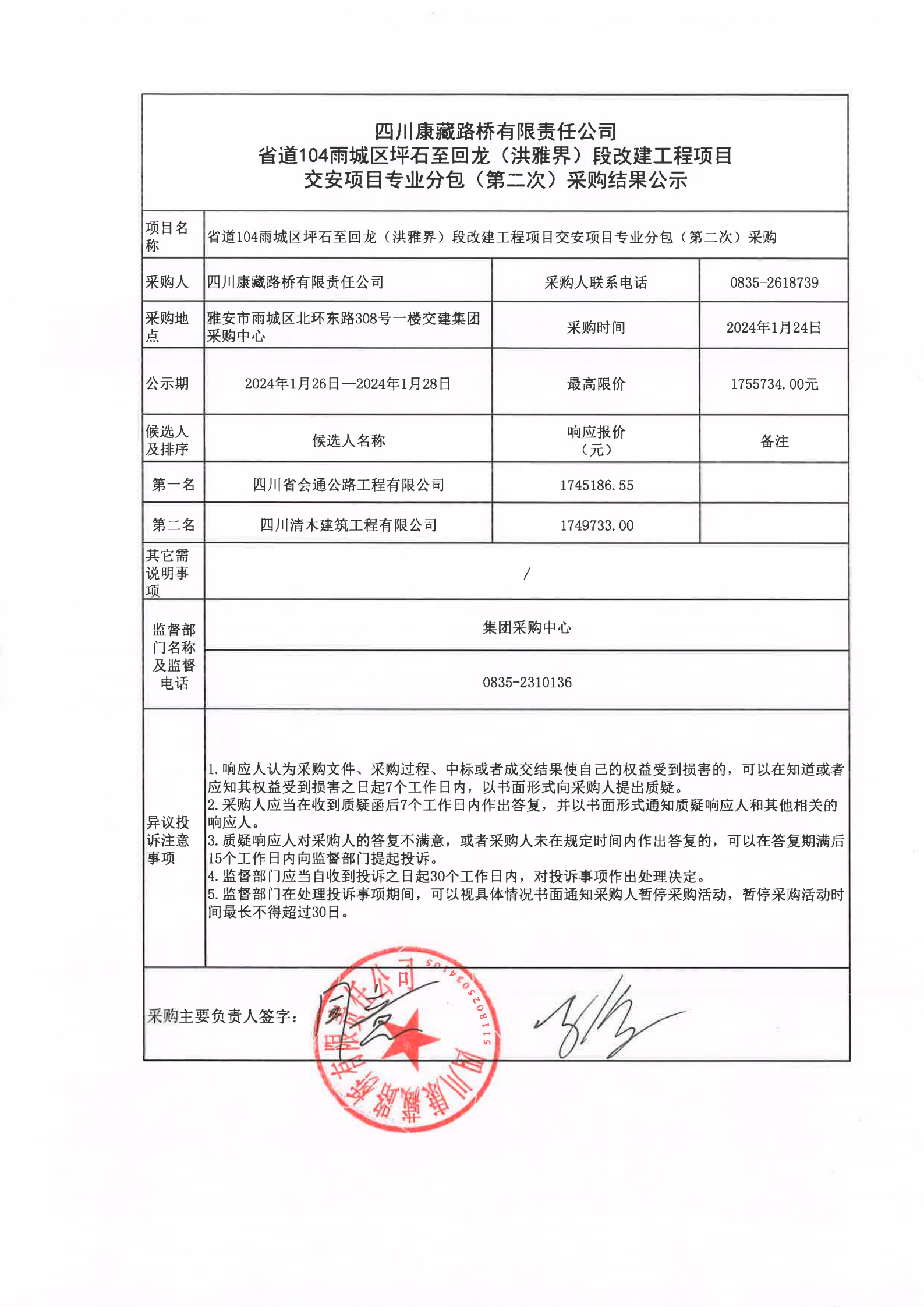 四川康藏路橋有限責(zé)任公司省道104雨城區(qū)坪石至回龍(洪雅界)段改建工程項(xiàng)目交安項(xiàng)目專(zhuān)業(yè)分包(第二次)采購(gòu)結(jié)果公示