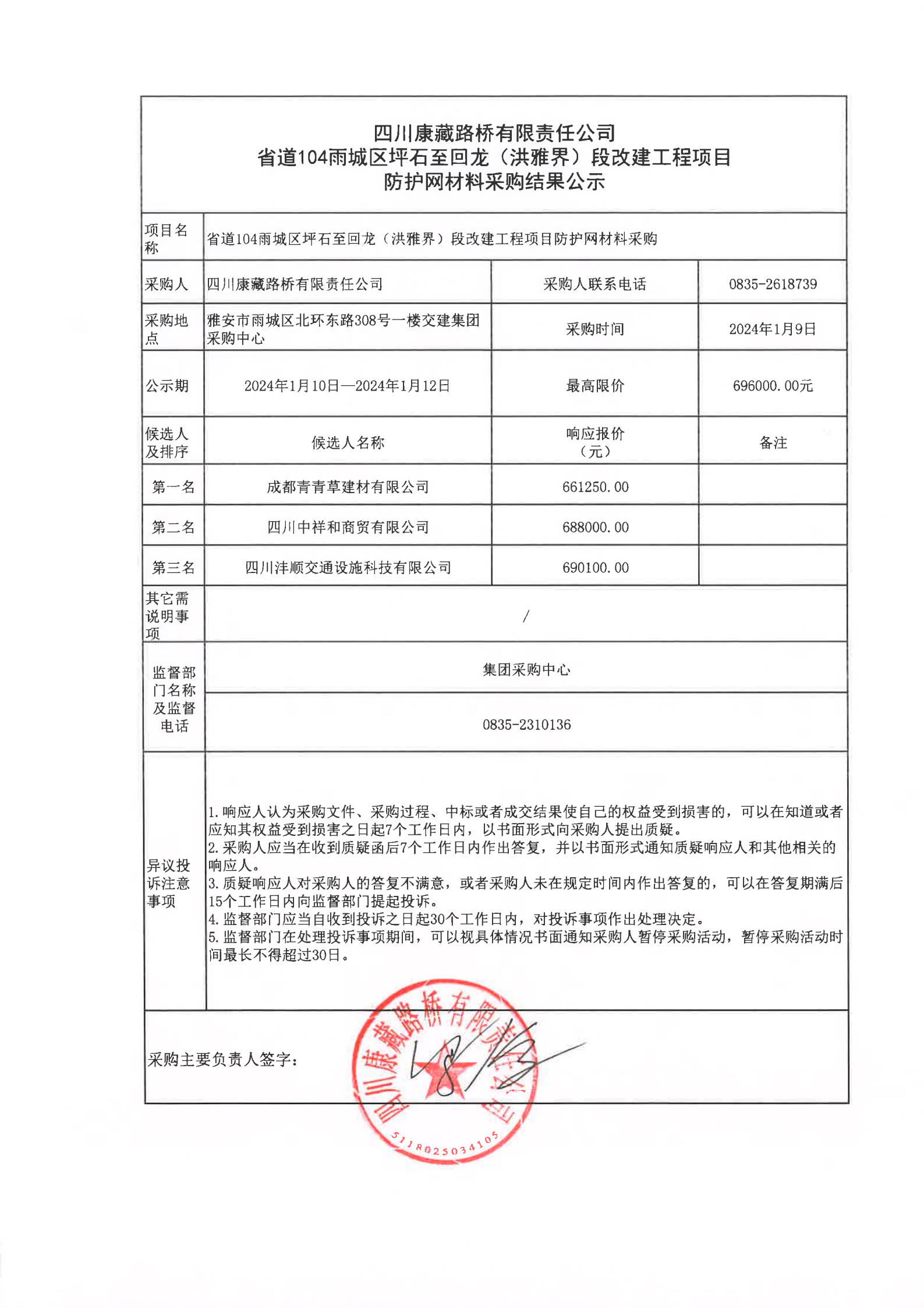 四川康藏路橋有限責(zé)任公司省道104雨城區(qū)坪石至回龍(洪雅界)段改建工程項目防護網(wǎng)材料采購結(jié)果公示