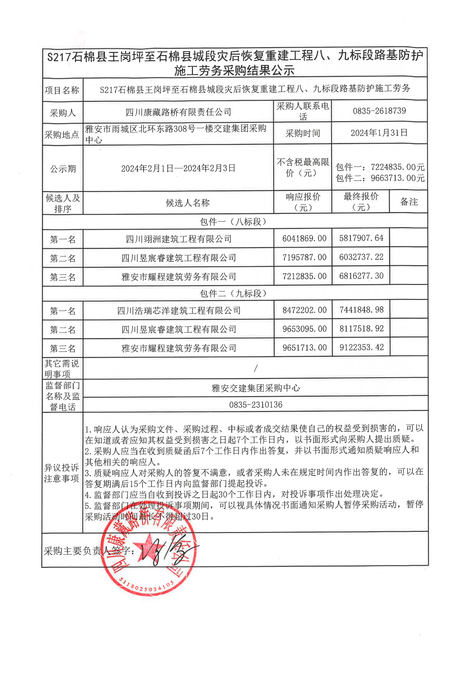 四川康藏路橋有限責(zé)任公司S217石棉縣王崗坪至石棉縣城段災(zāi)后恢復(fù)重建工程八、九標(biāo)段路基防護(hù)施工勞務(wù)采購結(jié)果公示