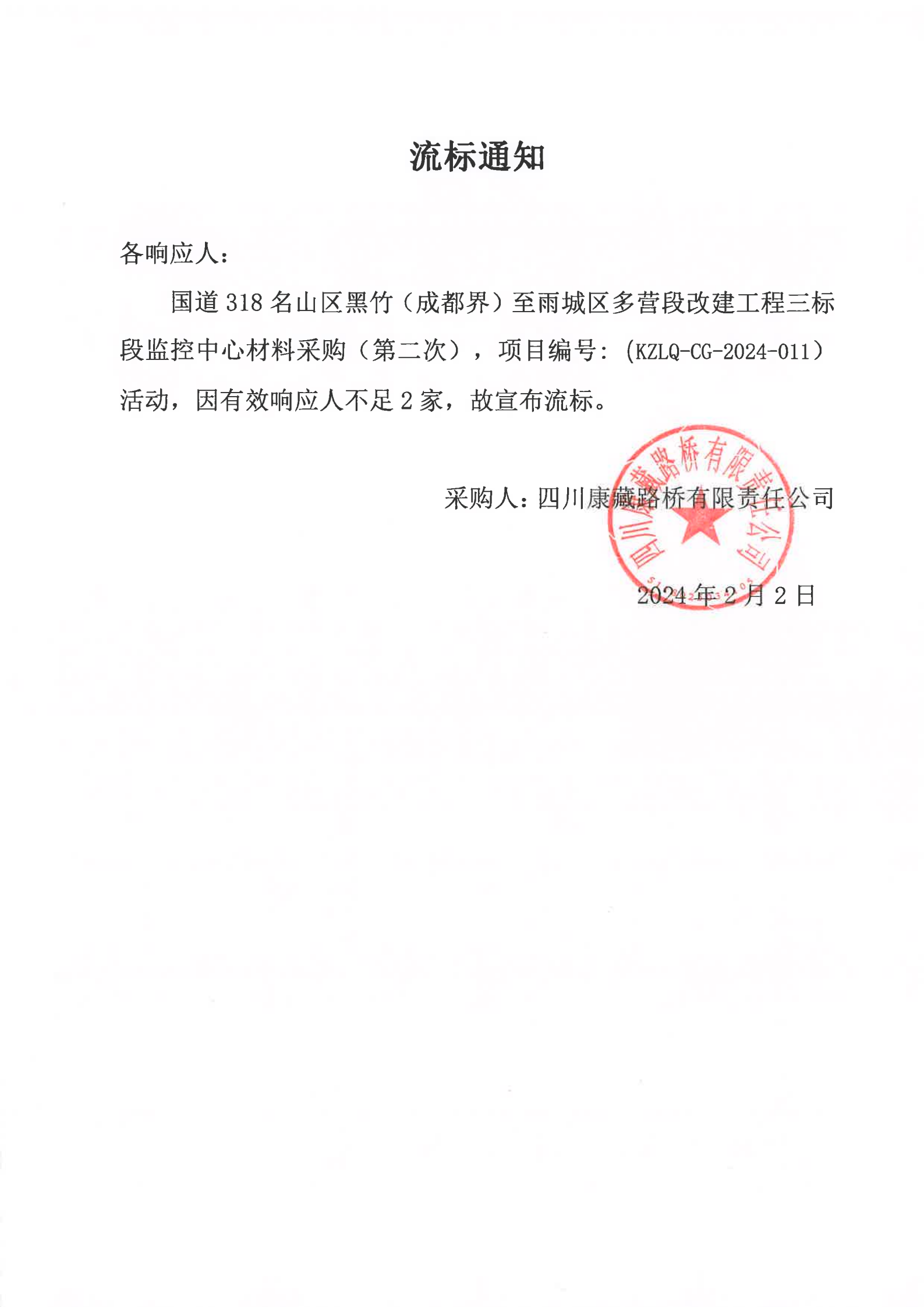 四川康藏路橋有限責(zé)任公司國道318名山區(qū)黑竹(成都界)至雨城區(qū)多營段改建工程三標(biāo)段監(jiān)控中心材料采購(第二次)流標(biāo)通知