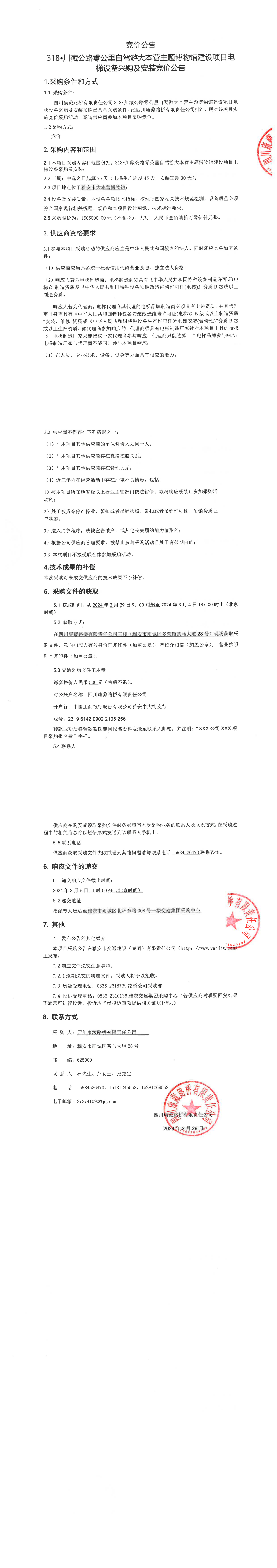 四川康藏路橋有限責(zé)任公司318·川藏公路零公里自駕游大本營(yíng)主題博物館建設(shè)項(xiàng)目電梯設(shè)備采購及安裝競(jìng)價(jià)公告