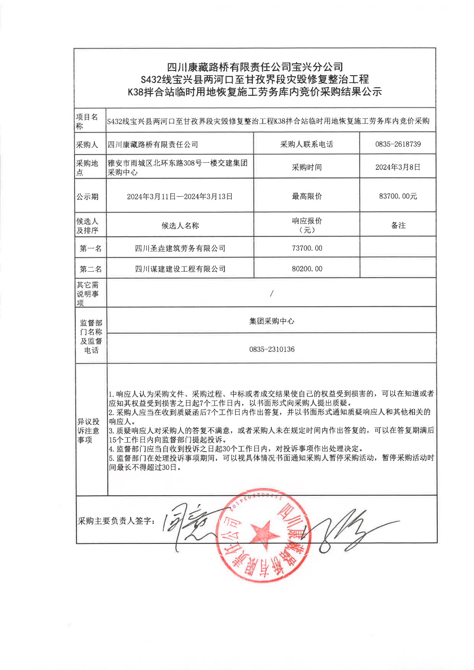四川康藏路橋有限責任公司寶興分公司S432線寶興縣兩河口至甘孜界段災毀修復整治工程K38拌合站臨時用地恢復施工勞務庫內(nèi)競價采購結(jié)果公示