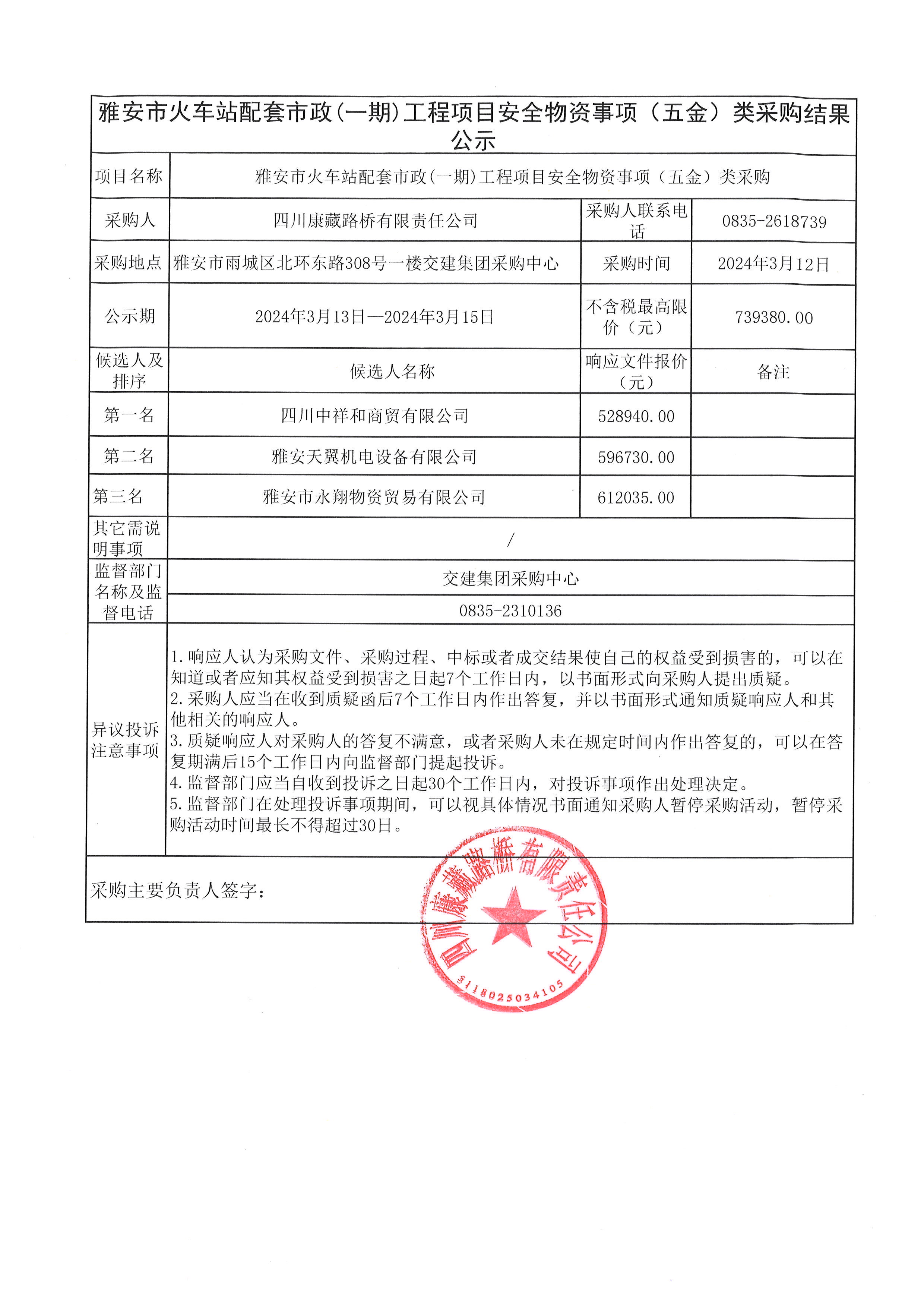 四川康藏路橋有限責(zé)任公司雅安市火車站配套市政(一期)工程項(xiàng)目安全物資(五金)采購(gòu)結(jié)果公示