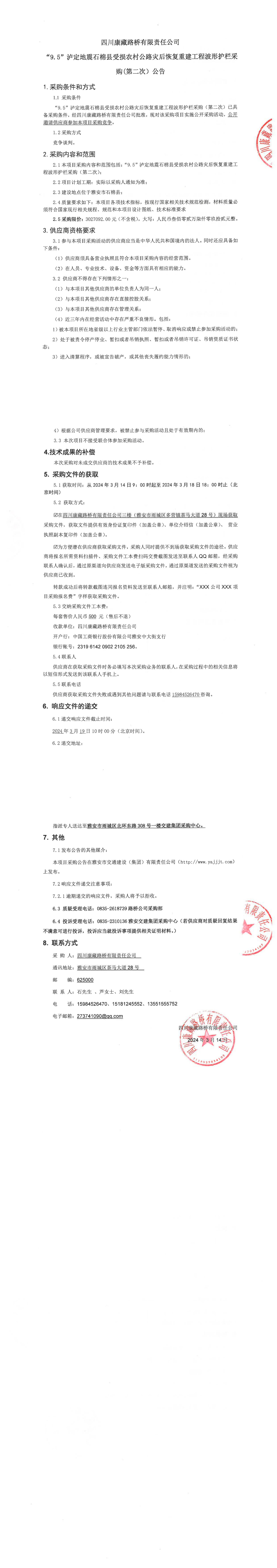 四川康藏路橋有限責任公司“9.5”瀘定地震石棉縣受損農村公路災后恢復重建工程波形護欄采購(第二次)公告