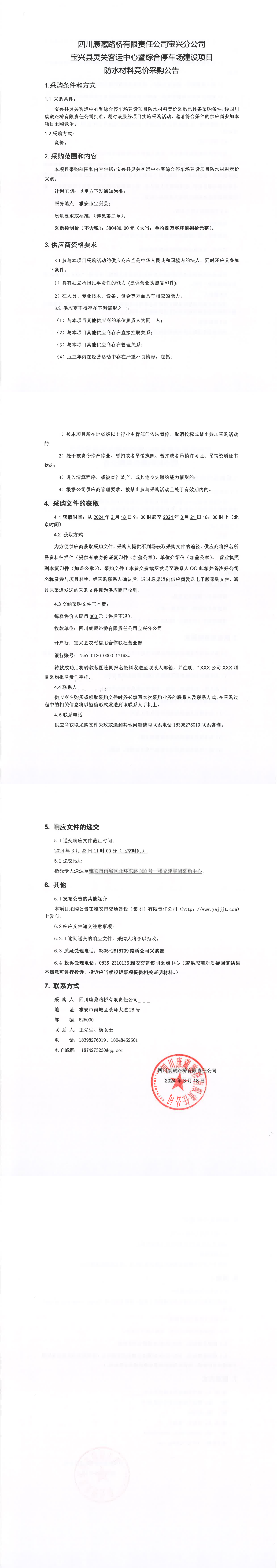 四川康藏路橋有限責(zé)任公司寶興縣靈關(guān)客運(yùn)中心暨綜合停車場(chǎng)建設(shè)項(xiàng)目防水材料競(jìng)價(jià)采購(gòu)公告
