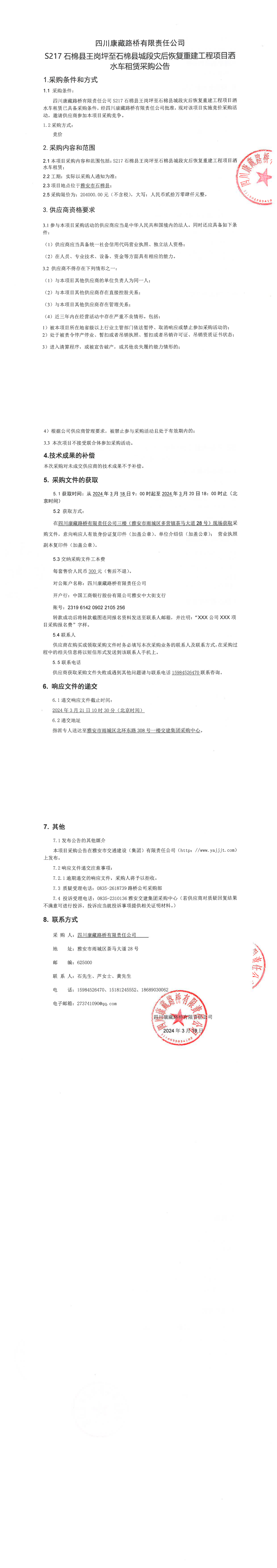 四川康藏路橋有限責(zé)任公司S217石棉縣王崗坪至石棉縣城段災(zāi)后恢復(fù)重建工程項(xiàng)目灑水車租賃采購(gòu)公告