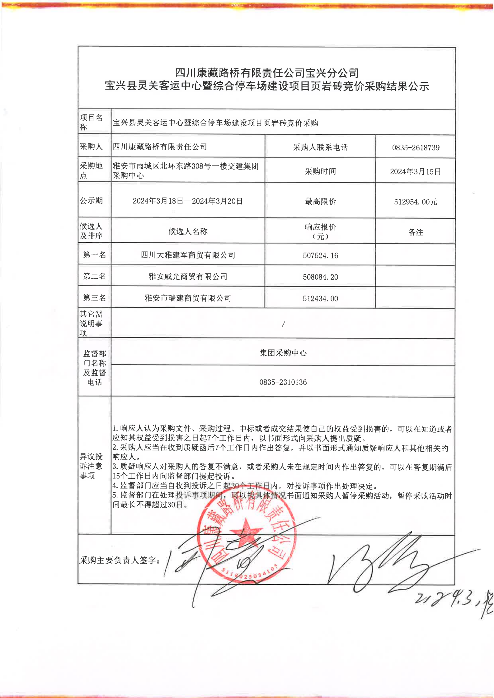 四川康藏路橋有限責(zé)任公司寶興分公司寶興縣靈關(guān)客運(yùn)中心暨綜合停車(chē)場(chǎng)建設(shè)項(xiàng)目頁(yè)巖磚競(jìng)價(jià)采購(gòu)結(jié)果公示