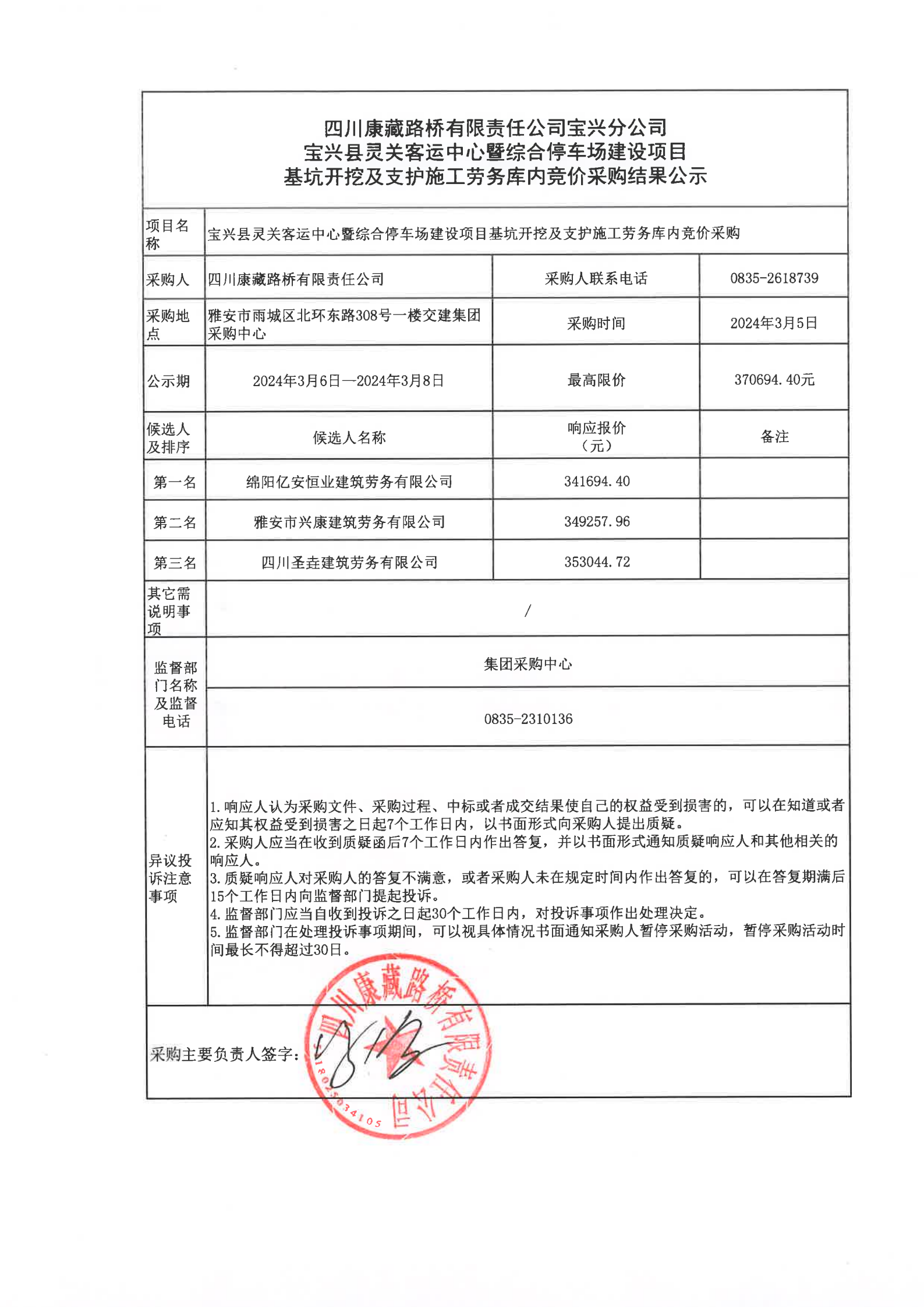 四川康藏路橋有限責(zé)任公司寶興分公司寶興縣靈關(guān)客運中心暨綜合停車場建設(shè)項目基坑開挖及支護施工勞務(wù)庫內(nèi)競價采購結(jié)果公示