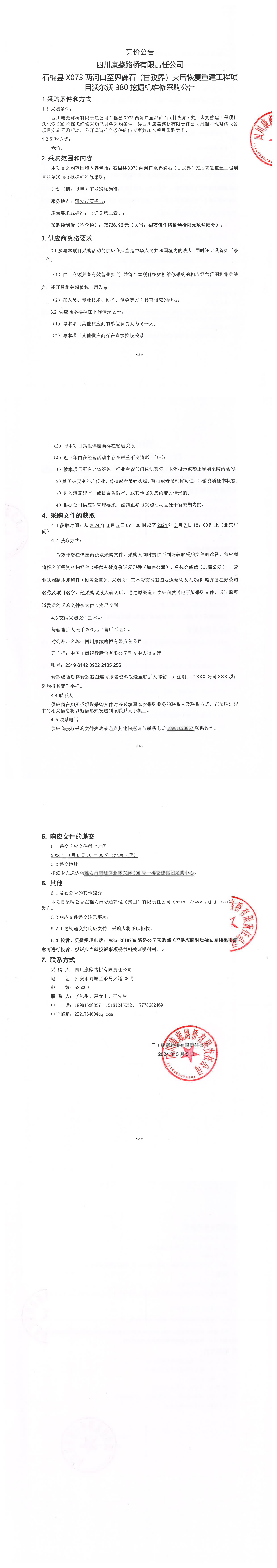 四川康藏路橋有限責任公司石棉縣X073兩河口至界碑石(甘孜界)災后恢復重建工程項目沃爾沃380挖掘機維修采購公告