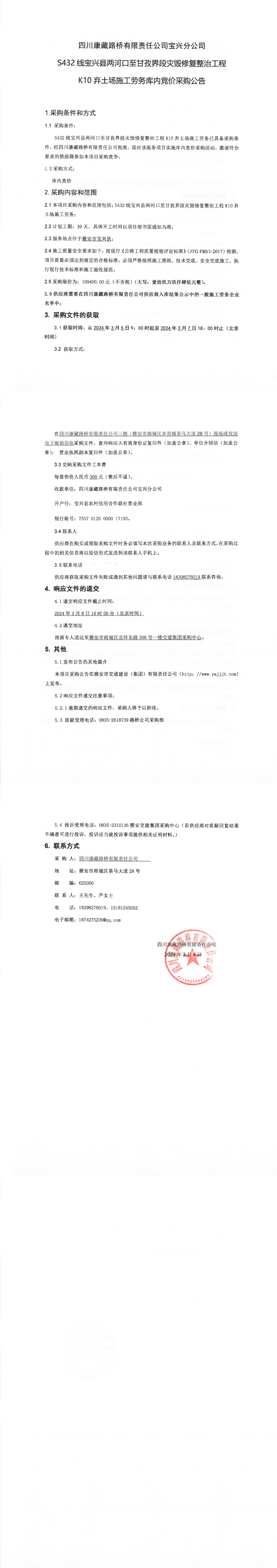 四川康藏路橋有限責(zé)任公司S432線寶興縣兩河口至甘孜界段災(zāi)毀修復(fù)整治工程K10棄土場(chǎng)施工勞務(wù)庫(kù)內(nèi)競(jìng)價(jià)采購(gòu)公告