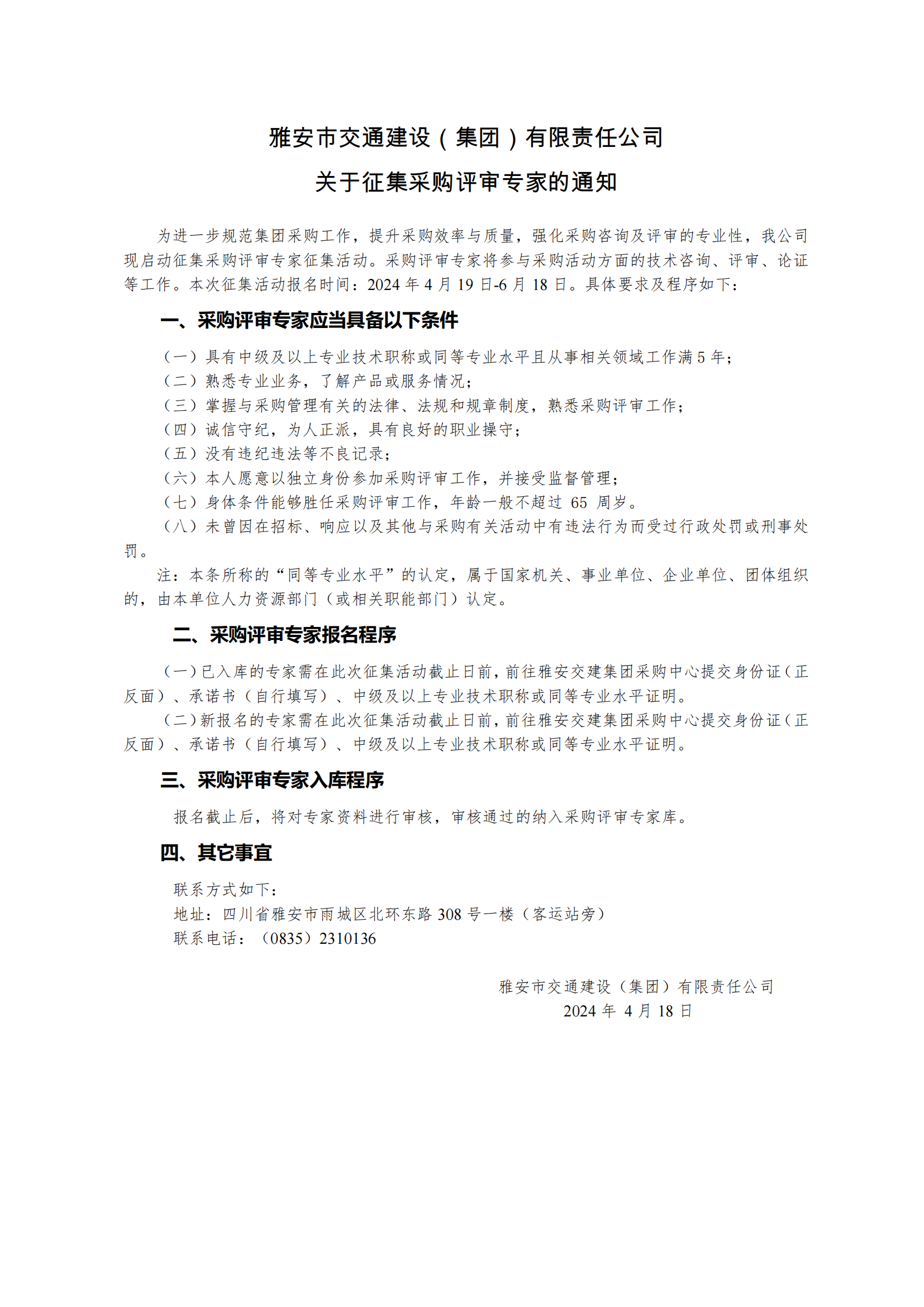 雅安市交通建設(shè)(集團(tuán))有限責(zé)任公司關(guān)于征集采購(gòu)評(píng)審專家的通知