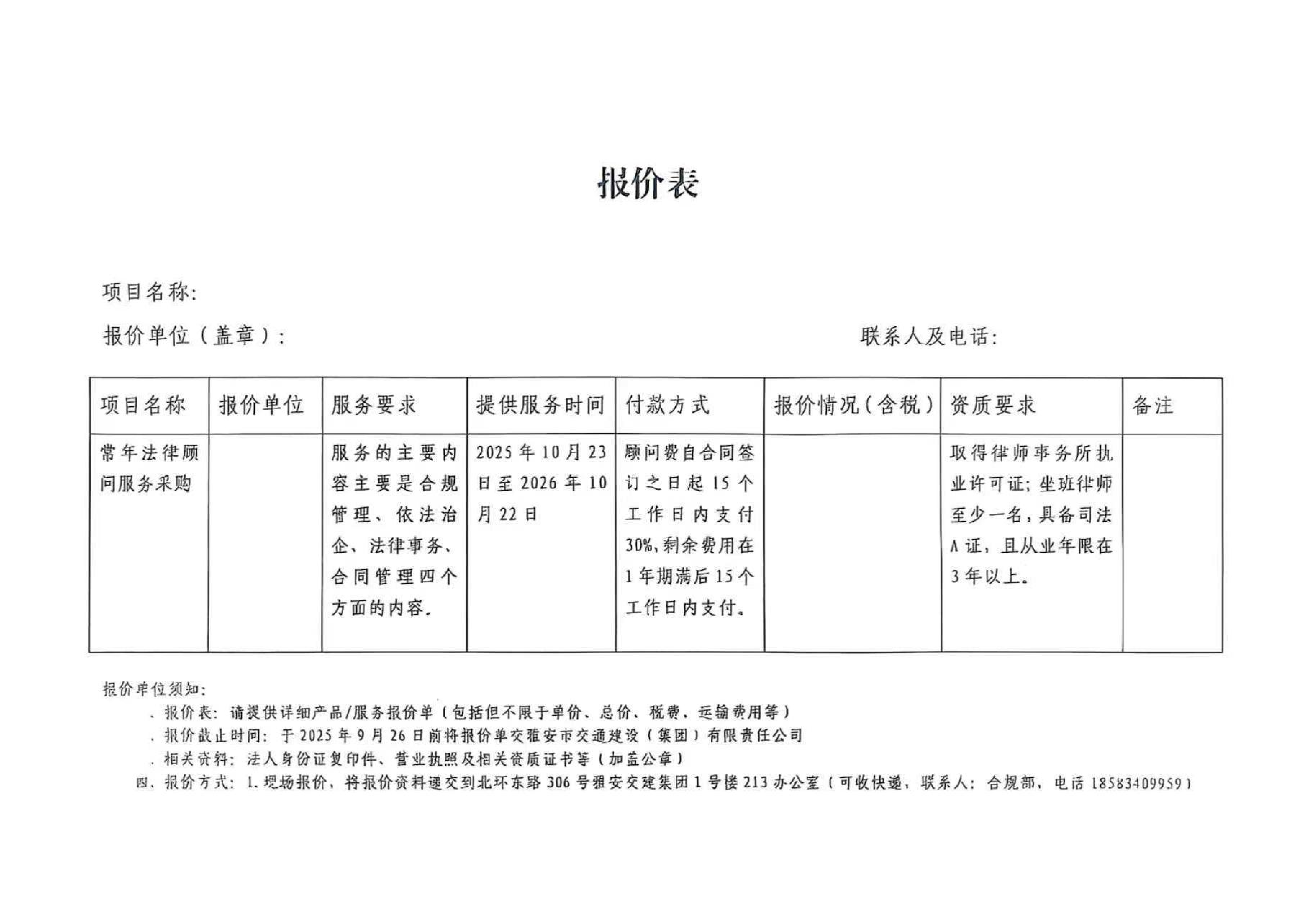 關(guān)于雅安市交通建設(shè)(集團(tuán))有限責(zé)任公司常年法律顧問(wèn)服務(wù)的詢價(jià)函