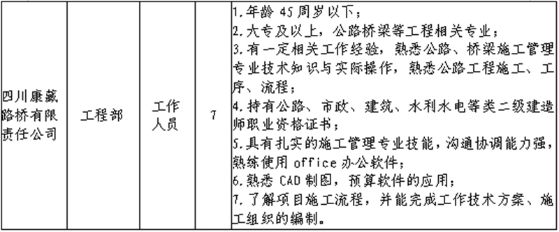 根據(jù)發(fā)展需要,決定面向社會公開招聘雅安市交通建設(集團)有限責任公司(以下簡稱“雅安交建集團”)所屬子公司工作人員16名,現(xiàn)將有關事項公告如下: