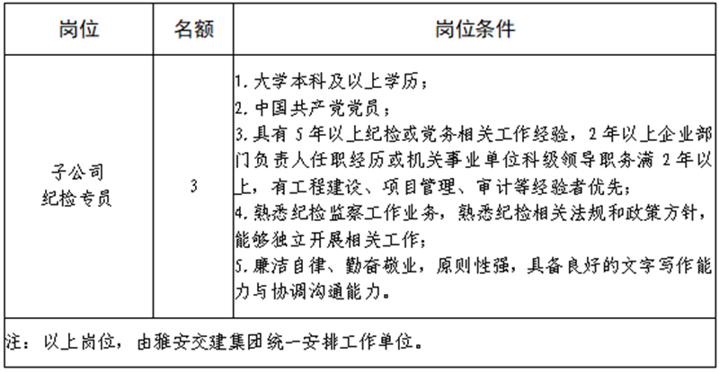 根據(jù)發(fā)展需要,決定面向社會公開招聘雅安市交通建設(shè)(集團)有限責(zé)任公司(以下簡稱“雅安交建集團”)所屬子公司紀(jì)檢專員3名,現(xiàn)將有關(guān)事項公告如下: