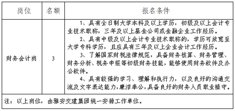 根據(jù)發(fā)展需要,決定面向社會(huì)公開招聘雅安市交通建設(shè)(集團(tuán))有限責(zé)任公司(以下簡稱“雅安交建集團(tuán)”)所屬子公司財(cái)務(wù)工作人員3名,現(xiàn)將有關(guān)事項(xiàng)公告如下:
