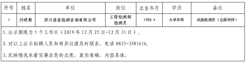 雅安交建集團子公司擬聘用人員公示(佳岳公司)