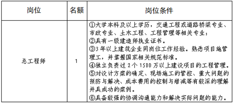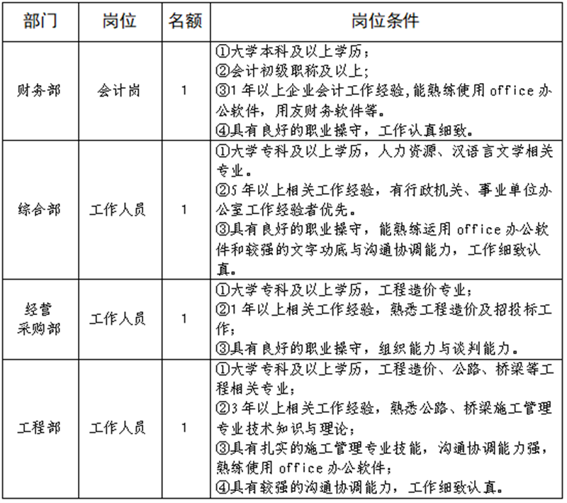 雅安交建集團(tuán)路橋有限責(zé)任公司是雅安市交通建設(shè)(集團(tuán))有限責(zé)任公司下屬子公司,主要從事道路、橋梁修建,F(xiàn)根據(jù)公司業(yè)務(wù)發(fā)展需要,擬向社會(huì)公開(kāi)招聘總工程師1名,工作人員4名,現(xiàn)將有關(guān)事項(xiàng)公告如下: