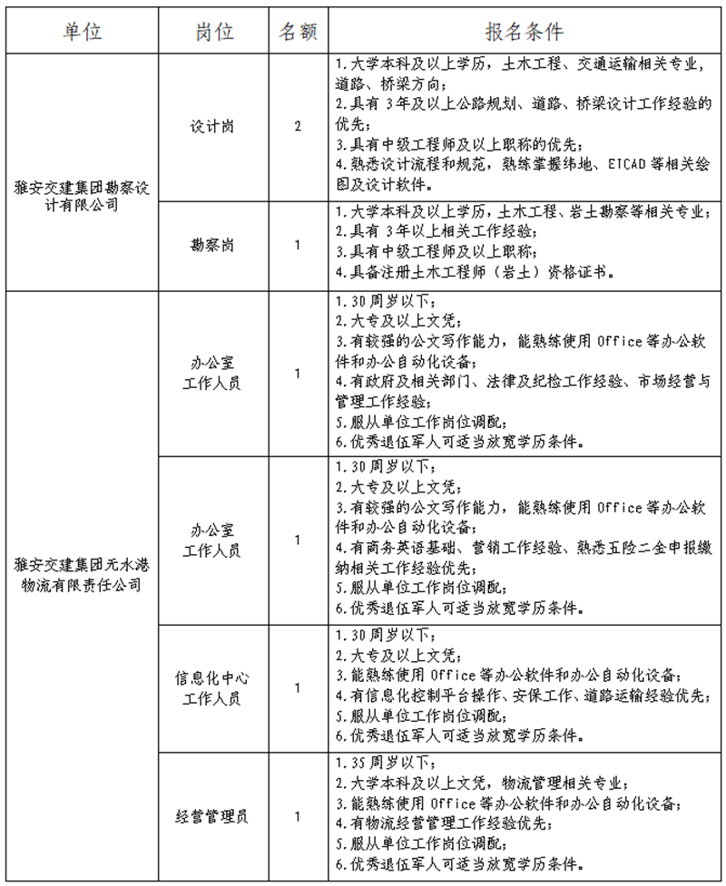 根據(jù)發(fā)展需要,決定面向社會(huì)公開招聘雅安市交通建設(shè)(集團(tuán))有限責(zé)任公司(以下簡稱“雅安交建集團(tuán)”)所屬子公司工作人員7名,現(xiàn)將有關(guān)事項(xiàng)公告如下: