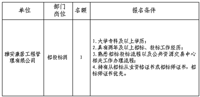 根據(jù)發(fā)展需要,決定面向社會(huì)公開招聘雅安市交通建設(shè)(集團(tuán))有限責(zé)任公司(以下簡稱“雅安交建集團(tuán)”)所屬子公司工作人員1名,現(xiàn)將有關(guān)事項(xiàng)公告如下: