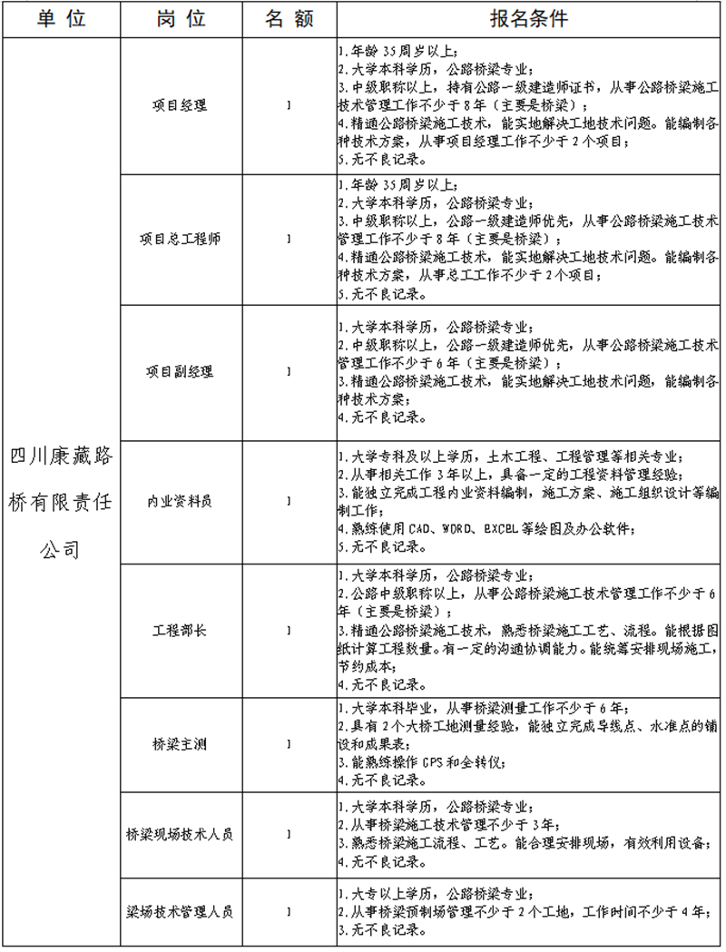 根據公司業(yè)務發(fā)展需要,決定面向社會公開招聘省道104線草壩至姚橋段改建項目部專業(yè)技術人才8名,現將有關事項公告如下: